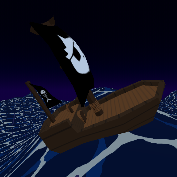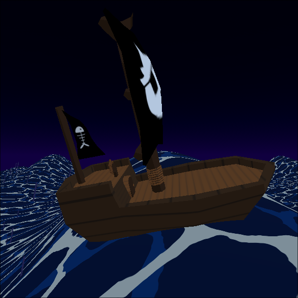 During the intro to a game I (perodically) work on, the player starts on a pirate ship. Realistic water doesn’t fit the style, and scroling textures on a big plane looked pretty boring. To make things a bit angrier I needed intense waves, and I needed those waved to actually affect the world.